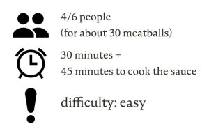 Put all the ingredients in a large bowl and start mixing everything with a spatula, then continue with your hands. You have to reach a soft but elastic consistency, and all the ingredients must be well blended together. If it looks too dry you can add a bit of milk, if it’s too soft you can add some breadcrumbs. Roll the mince mixture into about 30 medium sized meatballs.
