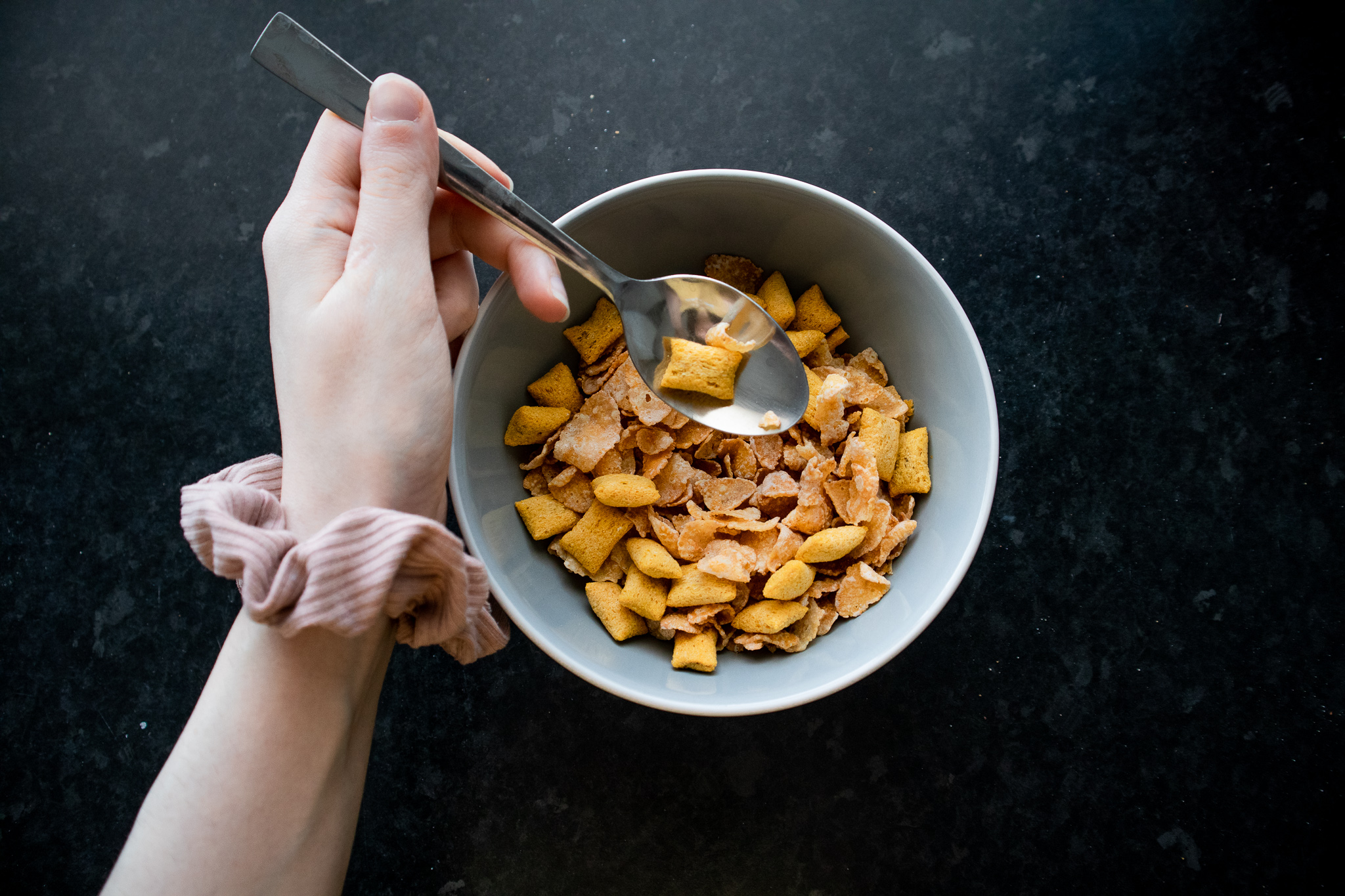 After fifteen minutes in which cupboard doors could be heard slammed together with puffs of impatience and disappointment, the budding chef returned to the room where the rest of the family was watching TV, carrying a large tray into which he had poured a layer of chocolate cereal covered with milk.