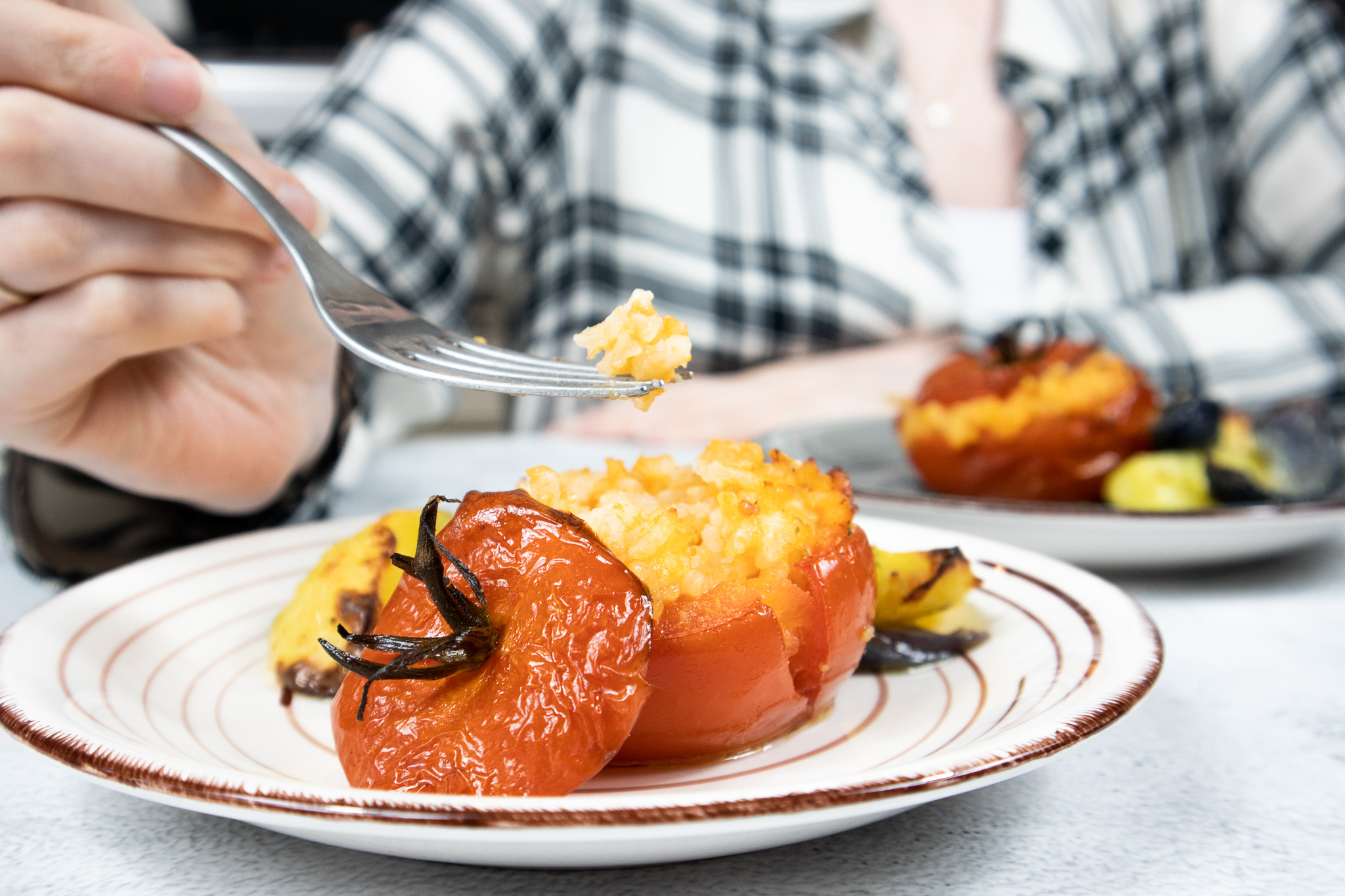 Fill the tomatoes with rice, cover each tomato with its cap and arrange them on the bed of potatoes and onions. Drizzle with a little extra virgin olive oil and half a glass of dry white wine.